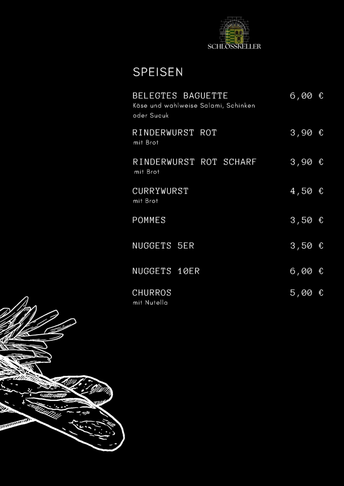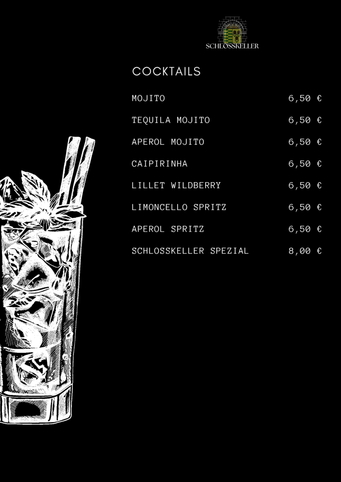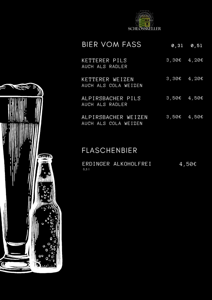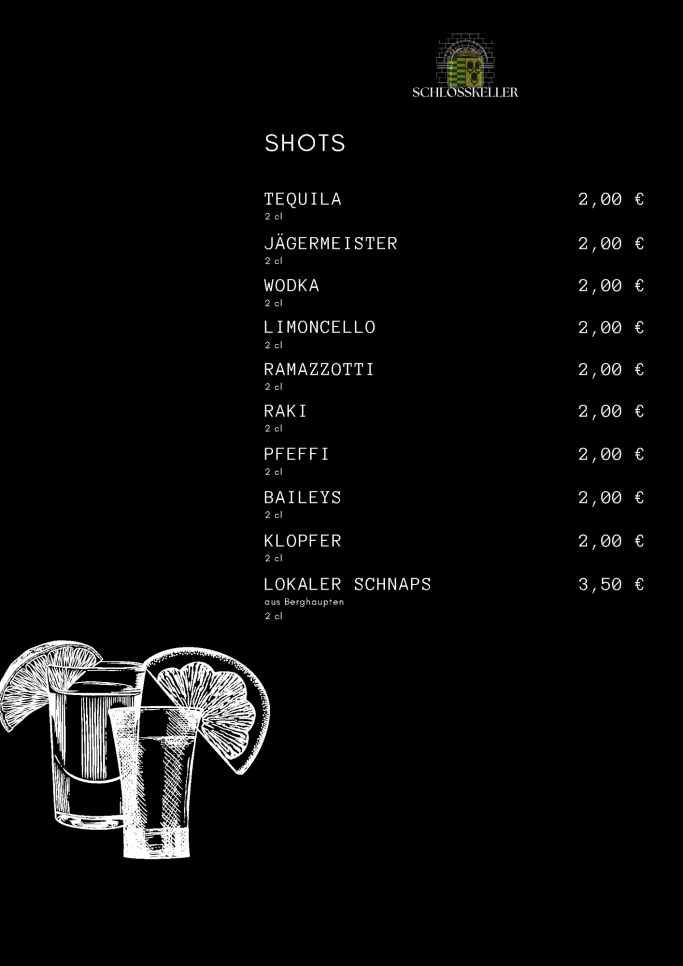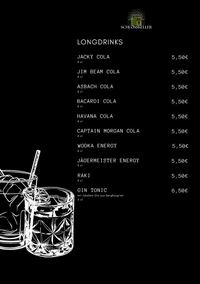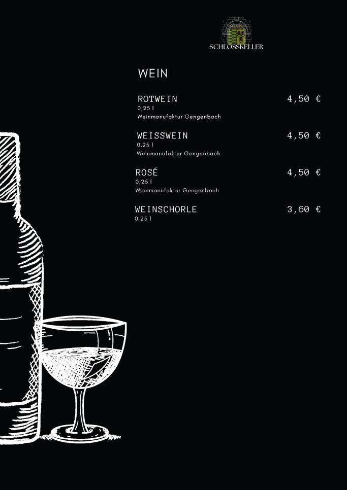 Genießen Sie unsere exklusive Auswahl an Weinen und hochwertigen Spirituosen, die perfekt zu unseren Gerichten passen. Im Schlosskeller finden Sie das ideale Getränk, um Ihren Besuch abzurunden.